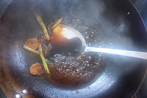6. In the same wok, add 2 slices of ginger and the white part of the scallions, 2 tsp dark soy sauce, 1 Tbsp of light soy sauce, 2 Tbsp sugar or an equal amount of rock sugar, and 2 Tbsp water. Simmer over low heat to extract flavors from the aromatics and dissolve sugar.